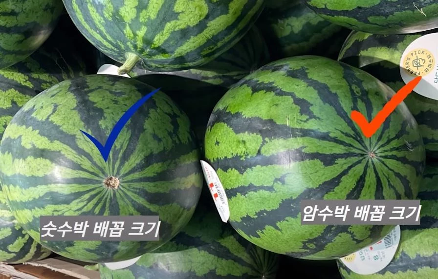 위에 1번에 나와있는 꼭지 반대편에 배꼽도 확인해 주세요! 이 배꼽이 작은 수박이 맛있는 수박입니다. 배꼽이 작은 수박이 껍질도 얇고 씨가 적고 당도도 더 높다고 합니다.