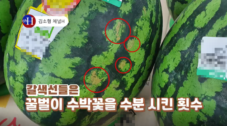 수박 겉면에 상처가 난 것을 보신 적이 있으실까요? 저는 아직 보진 못했는데요. 이 상처가 나있는 것은 수박끼리 부딪혀서 난 상처가 아닌 꿀벌들의 수정으로 인한 상처라고 합니다. 이 또한 당도가 높은 수박의 특징입니다.