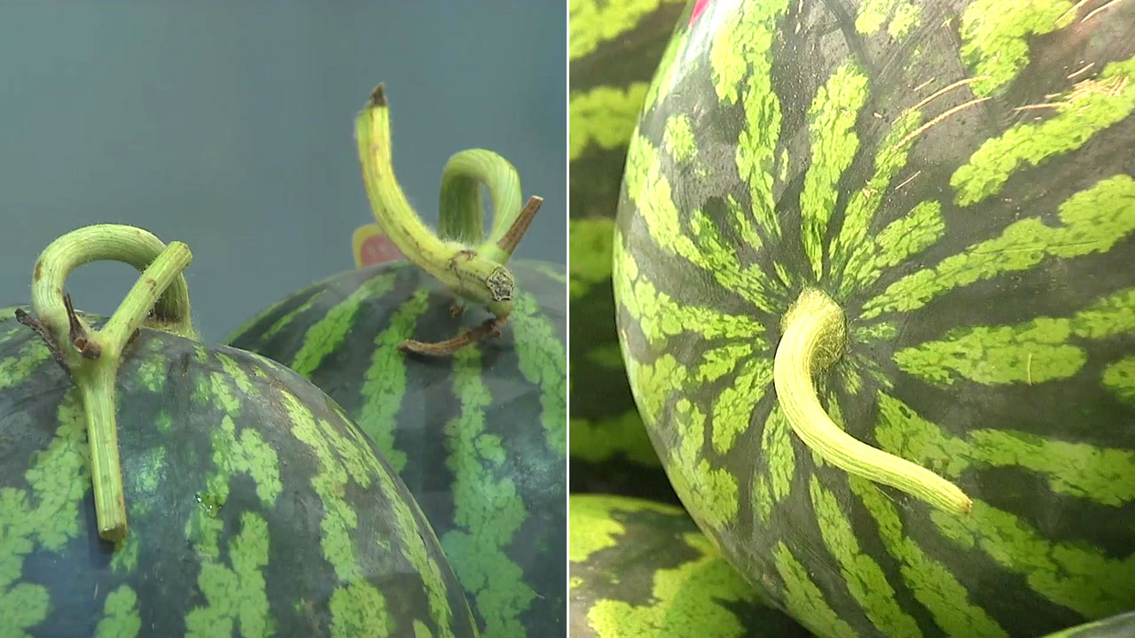 왼쪽 사진처럼 꼭지가 꼬여있는 수박을 고르셔야 합니다. 수박을 돌려주면서 햇빛이 잘 받게 만들어주면서 꼭지가 꼬여있는 건데요. 여러 방향으로 햇빛을 받았으면 맛있겠죠?