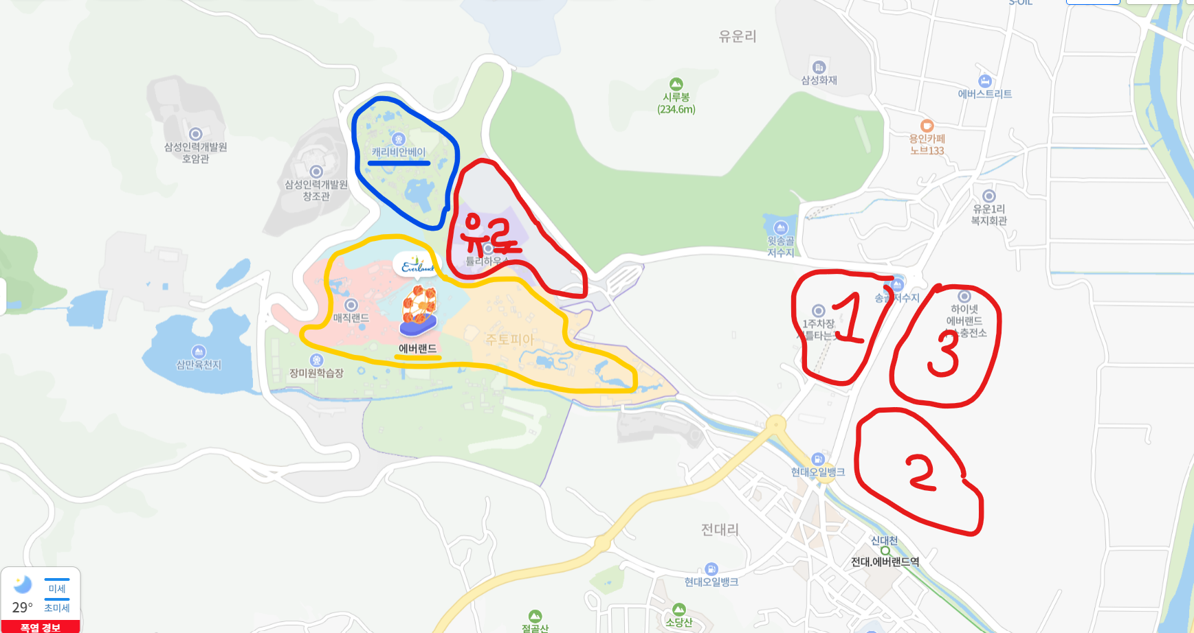에버랜드에 자차를 이용할 경우, 정문주차장에 유로로 1일 최대 15,000원입니다. 하지만 미리 예약을 하고 간다면 할인된 금액으로 주차를 하실 수 있습니다.