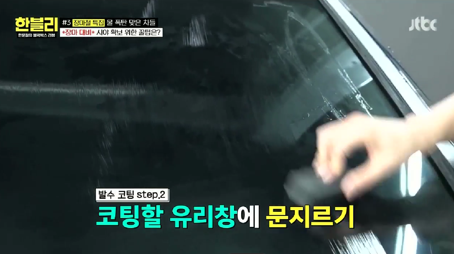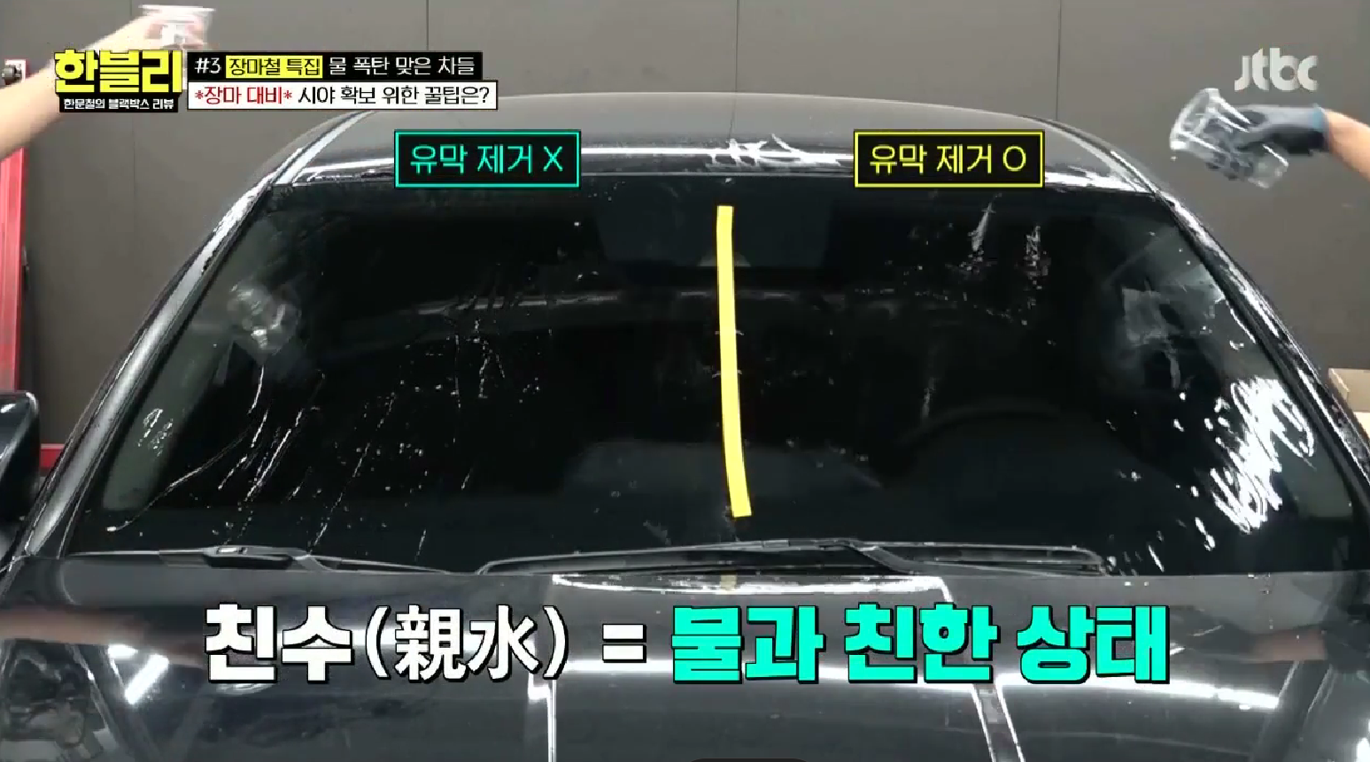 유리의 유막을 제거하면 유리는 친수상태가 됩니다. 친수효과란 물과 친한 상태를 말하는데, 앞유리에 물을 뿌리면 물들이 서로 엉키지 않고 자연스럽게 흘러내리게 되는 것을 보실 수 있습니다.