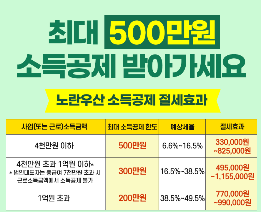 노란우산공제의 공제금 지급 사유가 재난, 질병등으로 대폭 확대되었습니다. 경영위기시에도 중간 정산을 받을 수 있습니다. 이번 6월부터 개편이 되어 최대 500만원 소득공제가 가능한 노란우산공제 꼭 신청하시길 바랍니다!