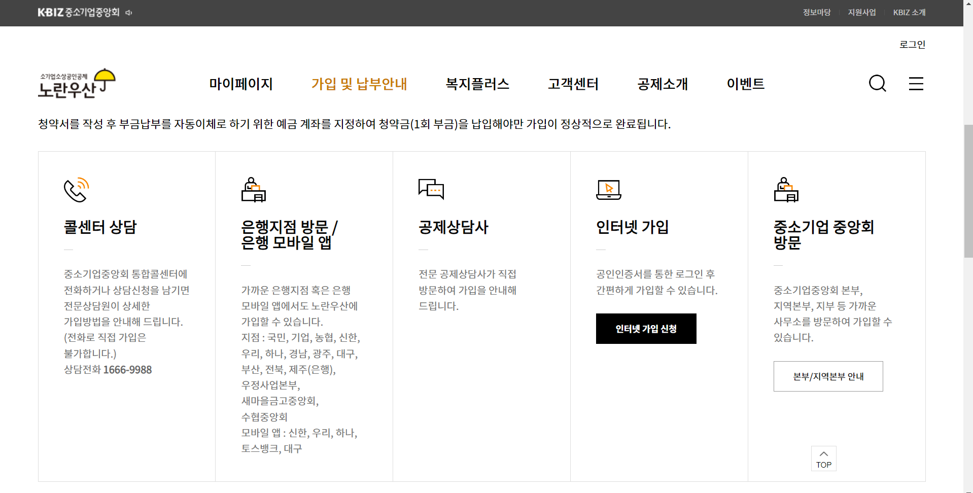 중소기업중앙회 통합콜센터에 전화하거나 상담신청을 남기면 전문상담원이 상세한 가입방법을 안내해 드립니다.(전화로 직접 가입은 불가합니다)